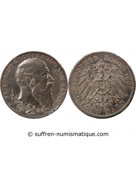 ALLEMAGNE, BADE, FREDERIC I - 5 MARK ARGENT, ANNIVERSAIRE - 1902 KARLSRUHE