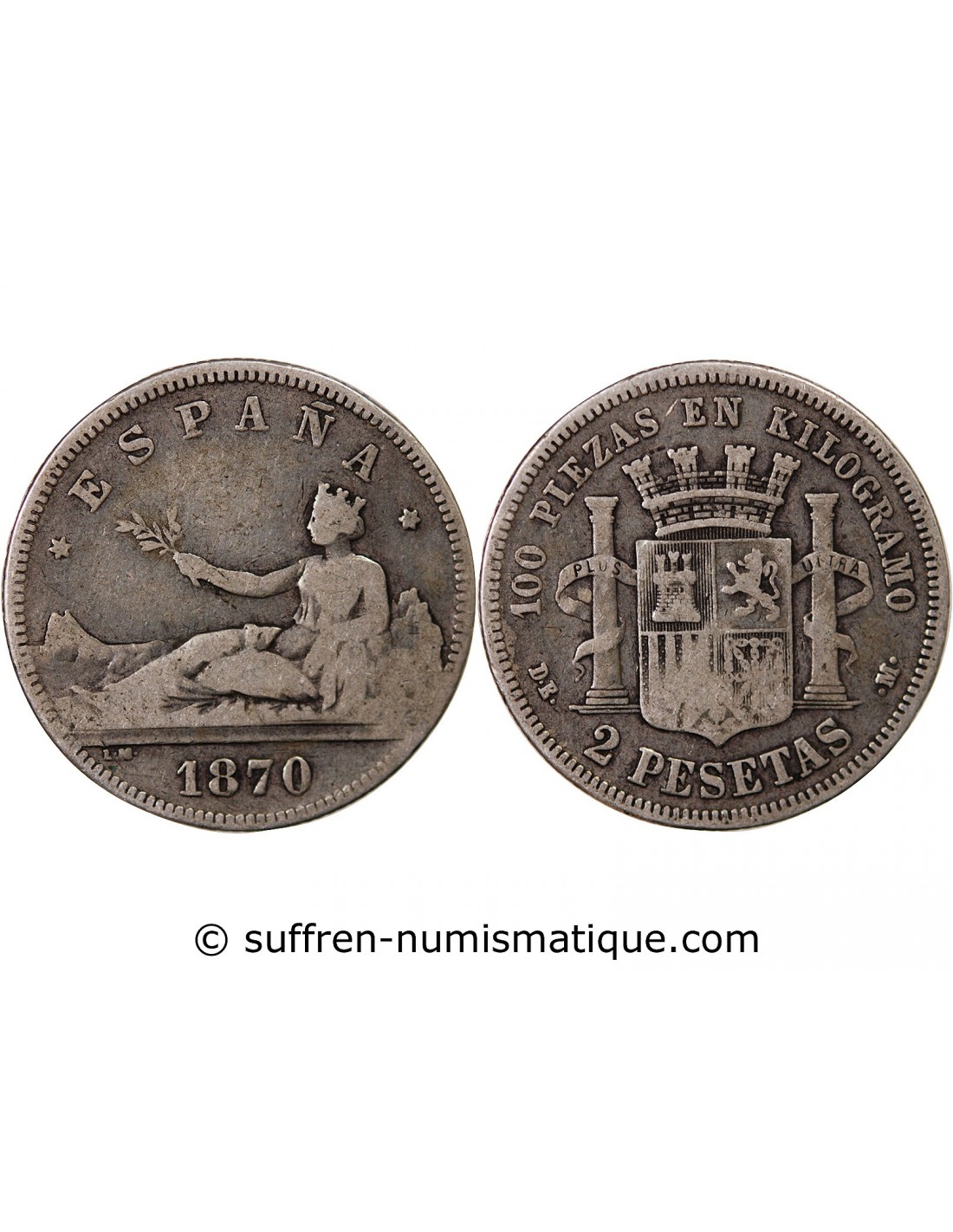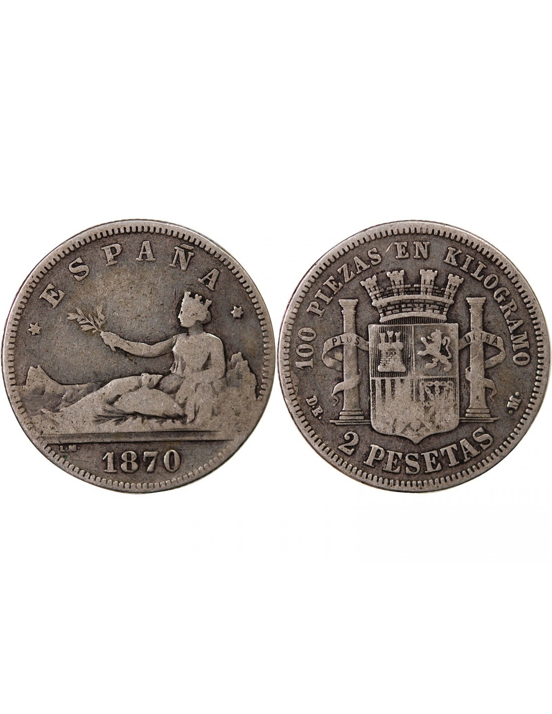 ESPAGNE, GOUVERNEMENT PROVISOIRE - 2 PESETAS ARGENT 1870 DEM