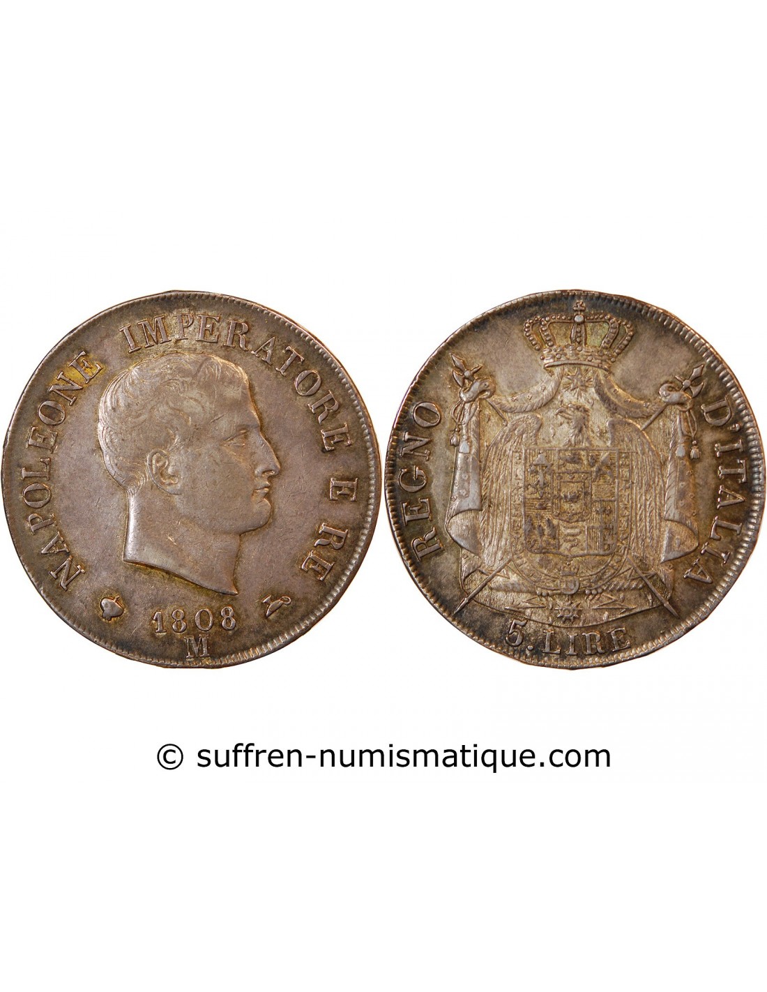 ITALIE, NAPOLEON 1er - 5 LIRE ARGENT 1808 M MILAN