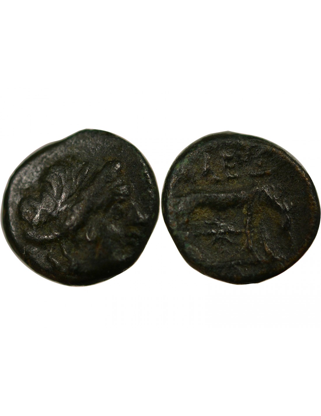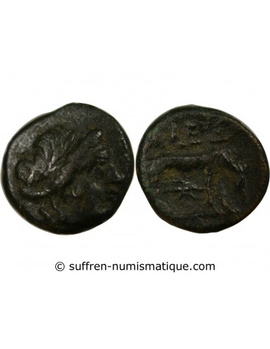 Revers : Cheval broutant à gauche ; étoile à huit branches en dessous ; ΑΛΕΞ