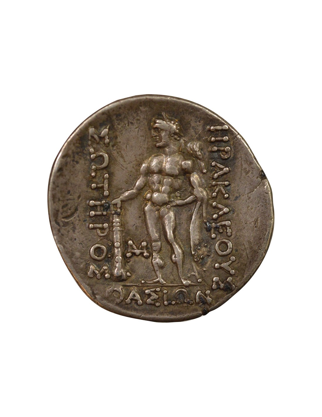- Revers : Le revers du tétradrachme présente une représentation de Dionysos Dionysos, le dieu du vin et de la fertilité, est généralement représenté avec une couronne de lierre et tenant une grappe de raisin.