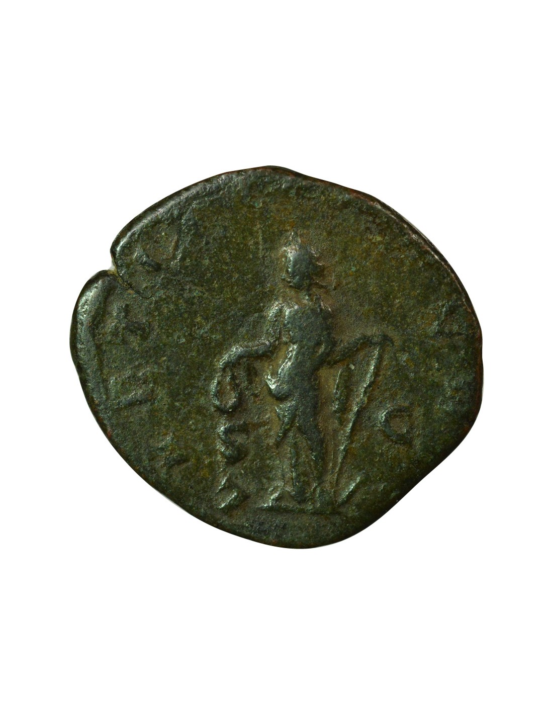 Le revers représentant Laetitia met en avant ici l’idée de joie et de prospérité publique associée au pouvoir impérial. Debout, tenant une couronne et une ancre, elle symbolise à la fois la victoire et la stabilité : la couronne évoque l’honneur et le triomphe, tandis que l’ancre représente la sûreté et une stabilité idéalisée du règne.