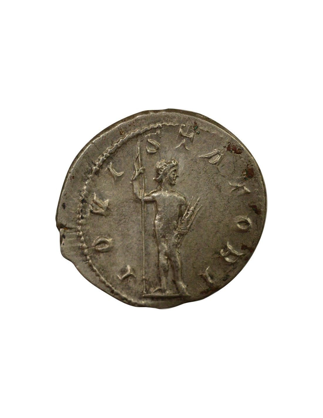 La représentation de Jupiter, roi des dieux, sur le revers de cet antoninien, s’inscrit dans une iconographie traditionnelle de la propagande impériale. Elle symbolise la puissance, la protection divine et la légitimité du pouvoir. Divinité centrale du panthéon romain, Jupiter est associé à l’ordre et à la prospérité de l’Empire. Son utilisation vise à renforcer l’image de Gordien III comme un souverain placé sous la protection des dieux, capable d’assurer la stabilité et la continuité de Rome malgré les difficultés de son époque.