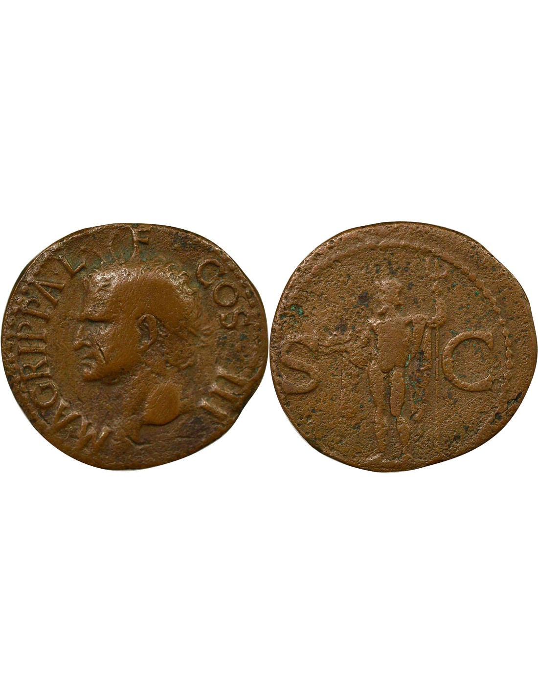 Cet as en cuivre, frappé à Rome entre 37 et 41 après Jésus-Christ, constitue une émission commémorative ordonnée par l'empereur Caligula en l'honneur de son grand-père maternel, Marcus Vipsanius Agrippa.