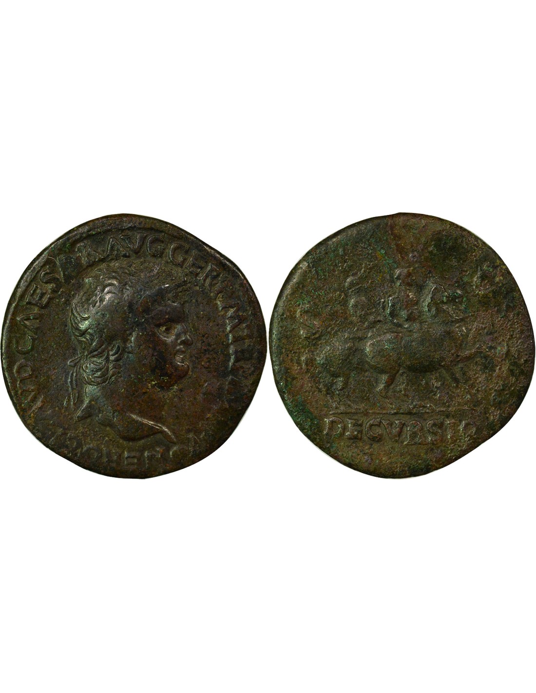 Le revers représente l’empereur en habit militaire, tenant horizontalement une haste de la main droite, monté sur un cheval au galop vers la droite. À l’arrière-plan, un cavalier porte un vexillum sur l’épaule. Cette scène renvoie au motif de la decursio, un exercice équestre ou une parade militaire mettant en valeur la discipline et la cohésion des troupes. Dans le contexte néronien, cette iconographie ne reflète pas une pratique personnelle du commandement militaire, mais relève plutôt d’une mise en scène symbolique du pouvoir. Elle vise à associer la figure impériale aux vertus traditionnelles du chef de guerre, en soulignant sa capacité à incarner l’autorité et la maîtrise de l’appareil militaire.