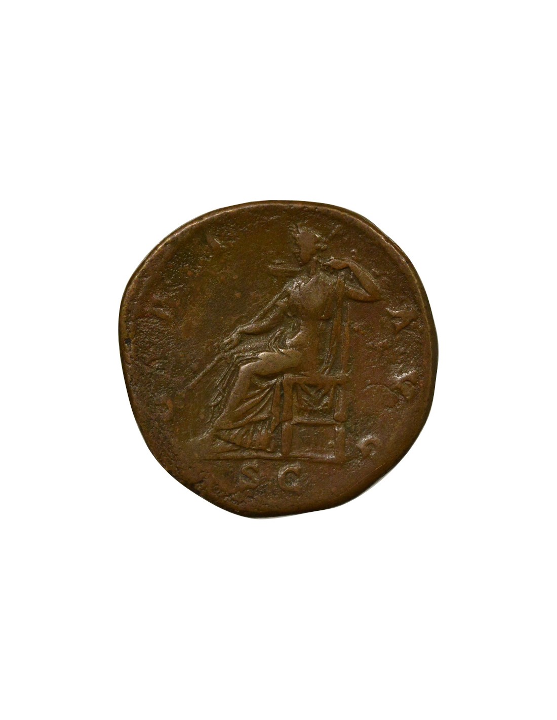 La présence de Ops sur ce sesterce s’inscrit dans cette logique idéologique. Déesse associée à la terre et à l’abondance, elle incarne la richesse agricole et la stabilité des ressources, éléments essentiels à l’équilibre de l’Empire. Son association avec l’effigie impériale ne renvoie pas à une réalité ponctuelle, mais participe à une mise en scène du pouvoir, où l’empereur apparaît comme le garant de la prospérité collective. Cette iconographie valorise ainsi la continuité du bien-être public et la solidité des structures économiques, en inscrivant l’action du princeps dans une représentation idéalisée d’abondance et de stabilité durable.
