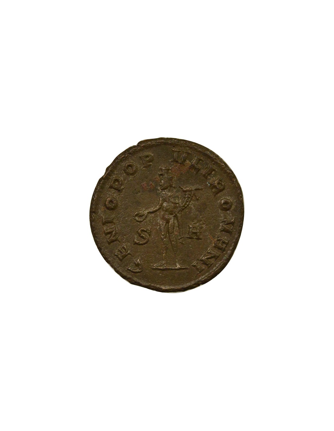 Le revers renvoie à la figure de Genius Populi Romani, incarnation symbolique de la communauté romaine. Son association avec la corne d’abondance et la patère s’inscrit dans un langage iconographique exprimant la prospérité, la stabilité et la protection divine accordée à l’Empire et à ses habitants.