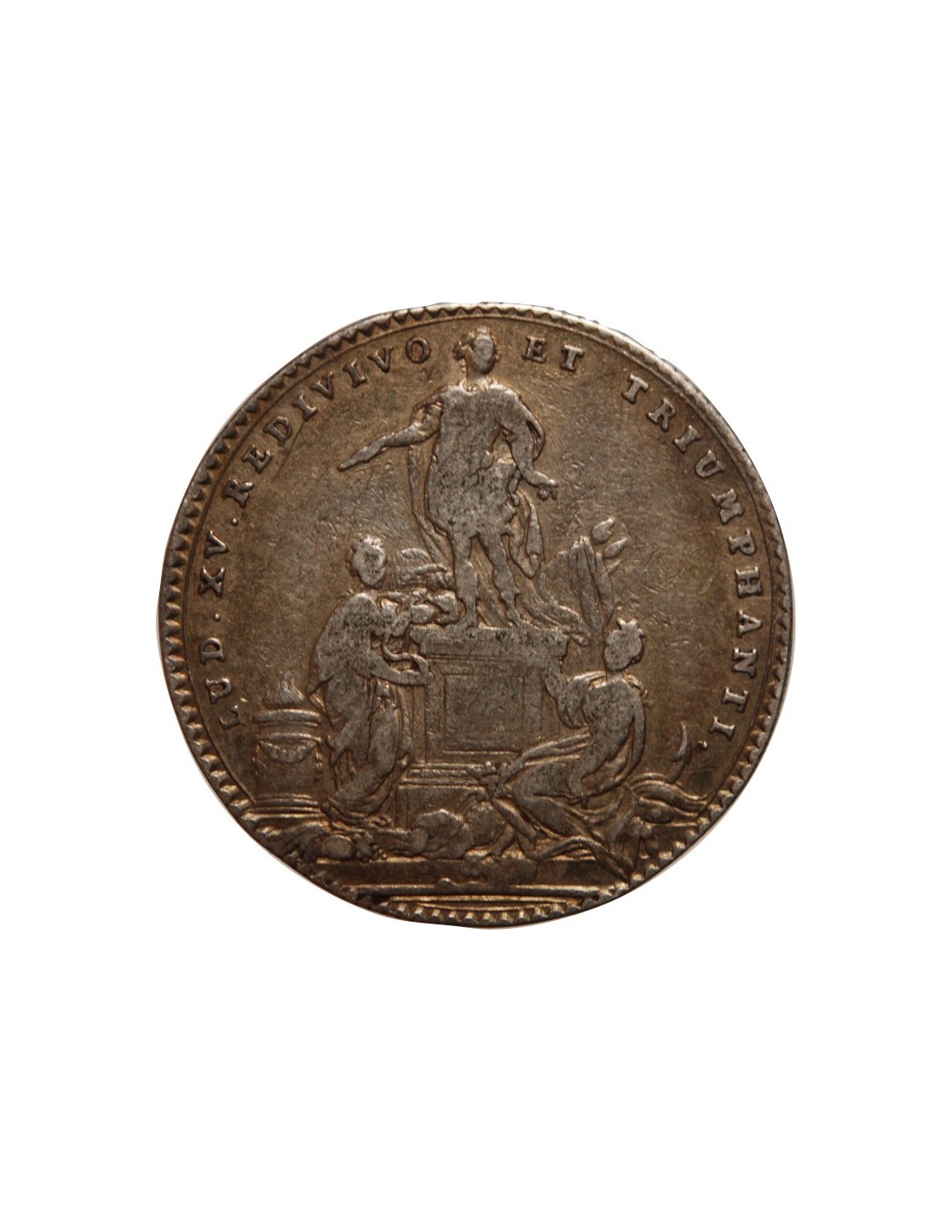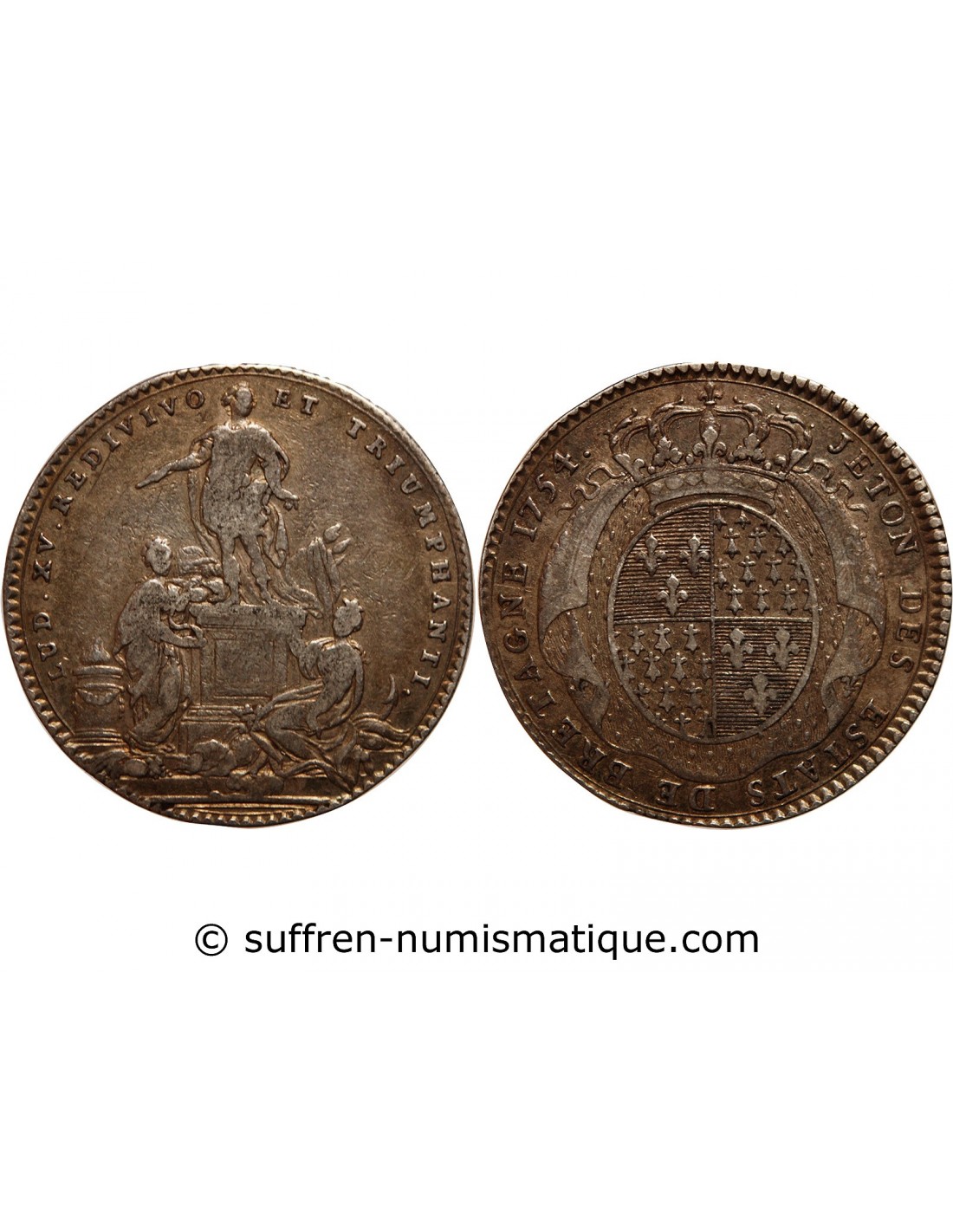 A droite la Bretagne assise devant les armes de la province derrière une ancre sortant de la mer ; à gauche Hygie et un autel allumé de flan du jeton