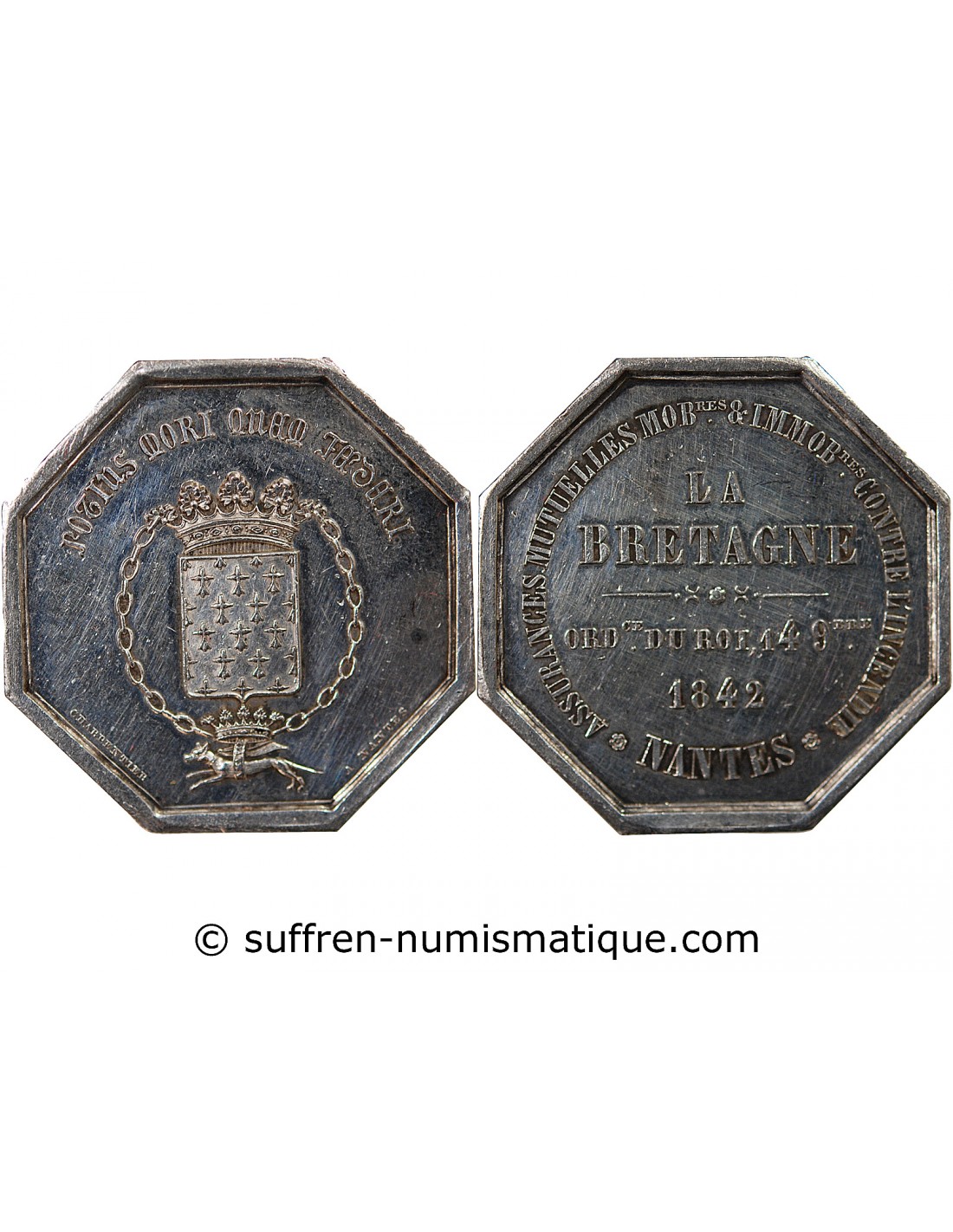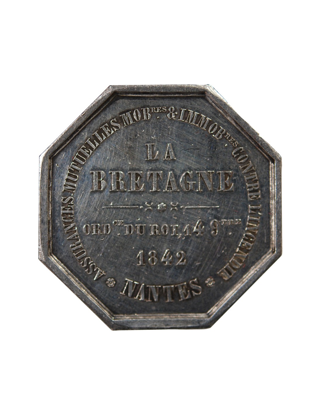 ASSURANCES MUTUELLES CONTRE L'INCENDIE, LA BRETAGNE - JETON ARGENT 1842 - NANTES POINCON MAIN (1845-1860)