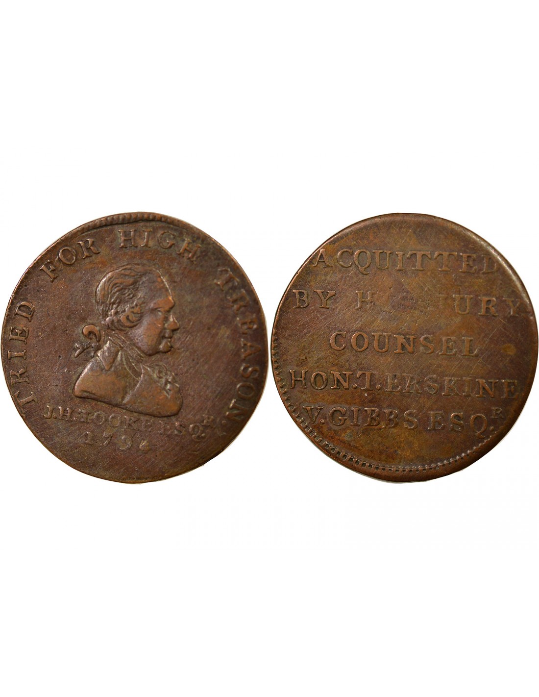 Jeton commémorant l’acquittement de John Horne Tooke ainsi que de deux autres républicains radicaux (Thomas Hardy et John Thelwall). Tous trois accusés de Haute Trahison, le jugement vira au fisaco pour le gouvernement.