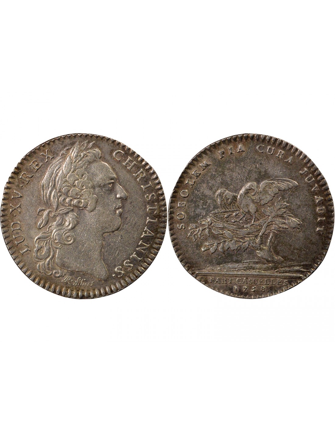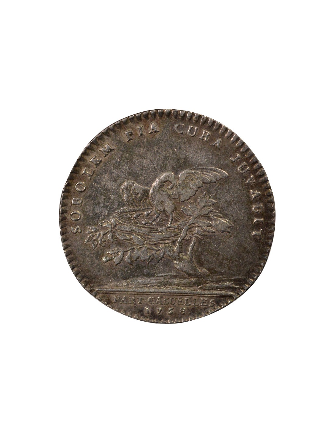 Revers : SOBOLEM PIA CURA JUVABIT / PART . CASUELLES / 1758 .