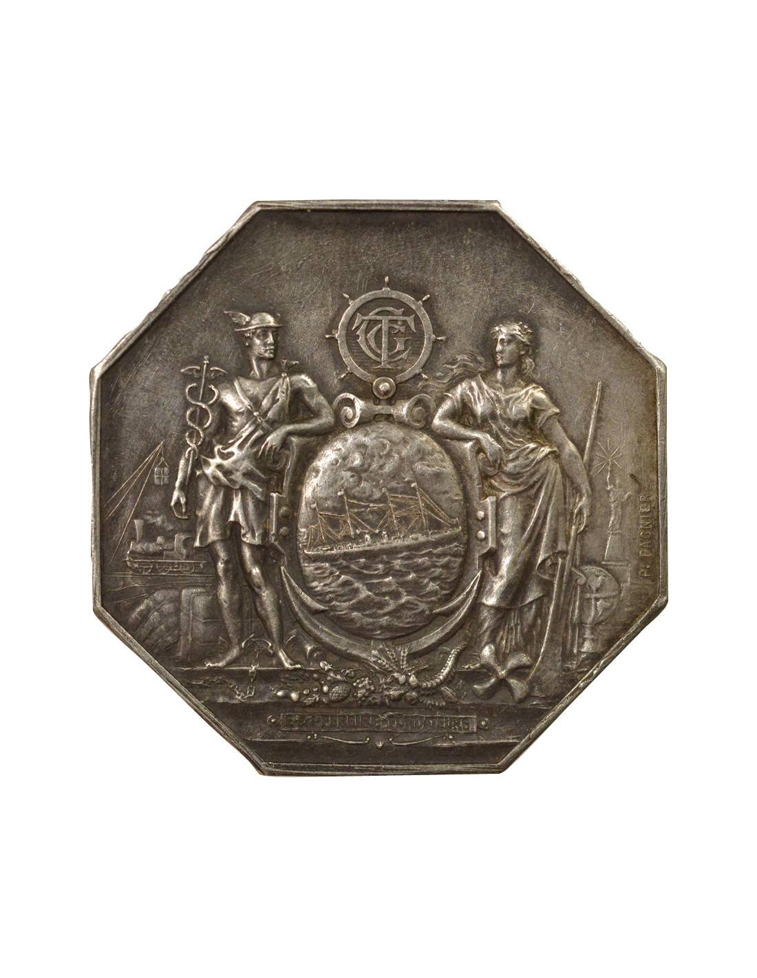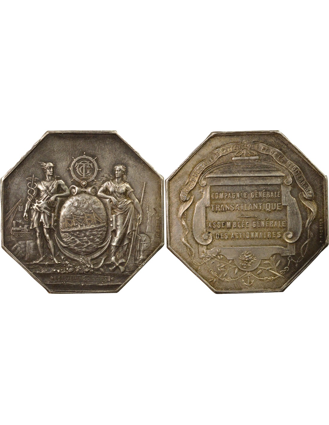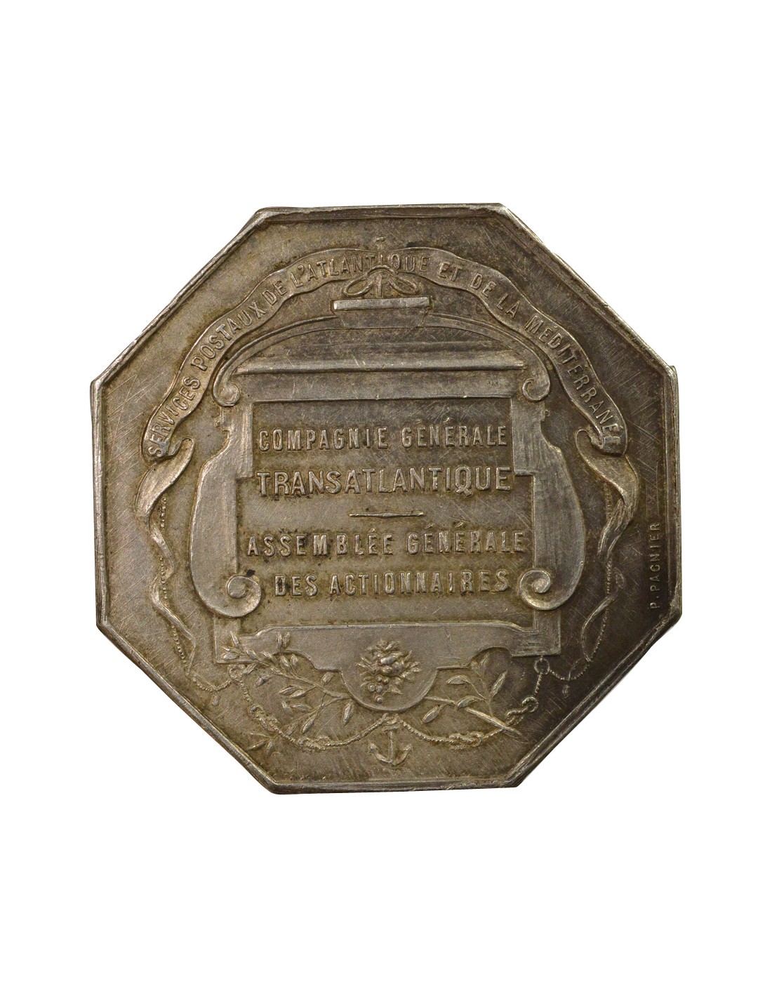 Revers : COMPAGNIE GÉNÉRALE / TRANSATLANTIQUE / ASSEMBLÉE GÉNÉRALE / DES ACTIONNAIRES / SERVICES POSTAUX DE L’ATLANTIQUE ET DE LA MÉDITERRANÉE