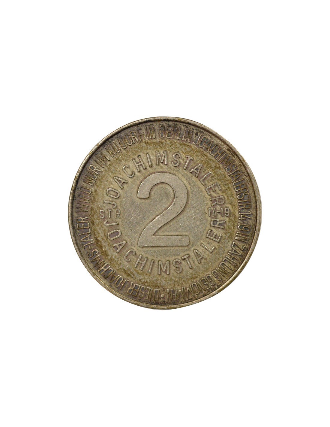 Revers : 2 / JOACHIMSTALER / JOACHIMSTALER / STR - 14-19 / . DIESER JOACHIMS TALER WIRD NUR IM KUDORF IN BERLIN JOACHIMSTALER STR 14 19 IN ZAHLUNG GENOMMEN
