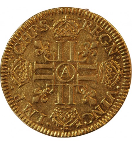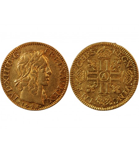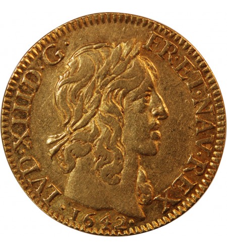 France LOUIS XIII - LOUIS D'OR A LA MECHE MI-LONGUE 1642 A PARIS R2 "variété VINC étoile"