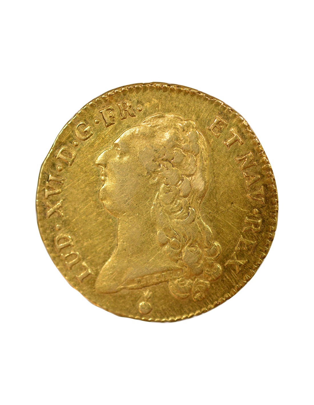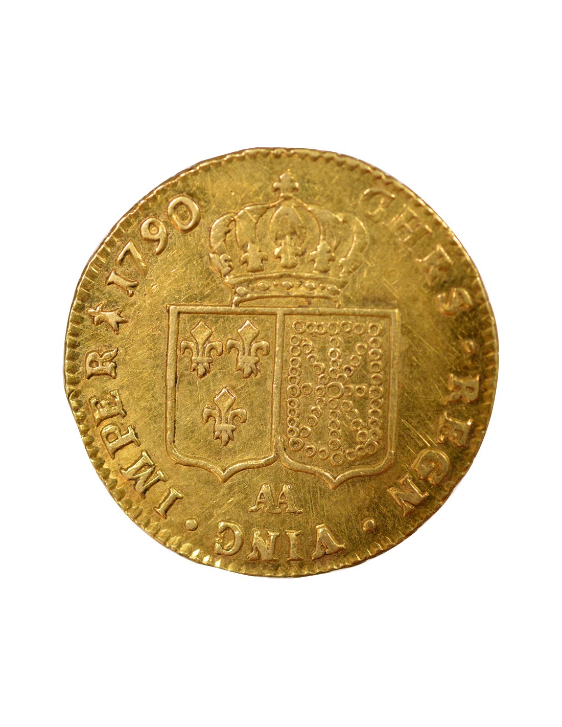 Double Louis d'Or, frappée en 1790 à Metz. La pièce est associée au règne de Louis XVI.