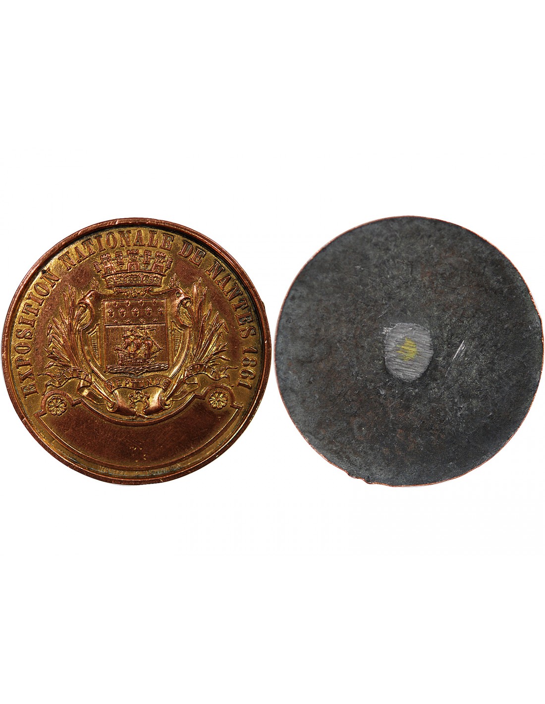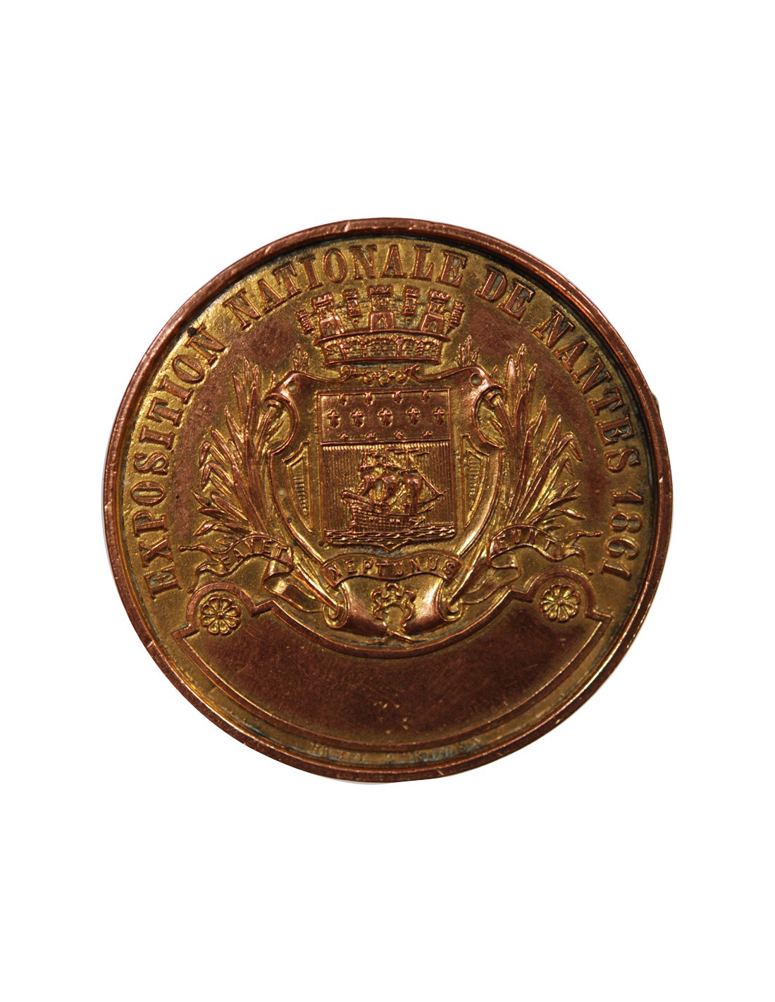 EXPOSITION NATIONALE DE NANTES 1861 - MEDAILLE, ESSAI UNIFACE ÉTAIN CUIVRÉ DORÉ, POINCON MAIN (1860)