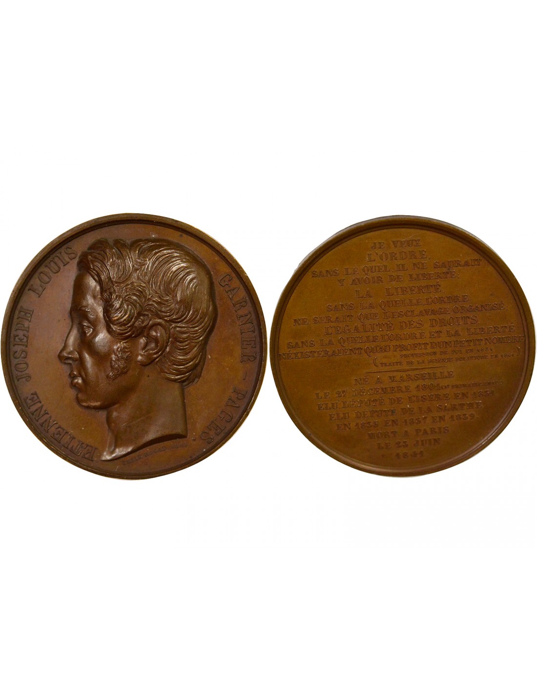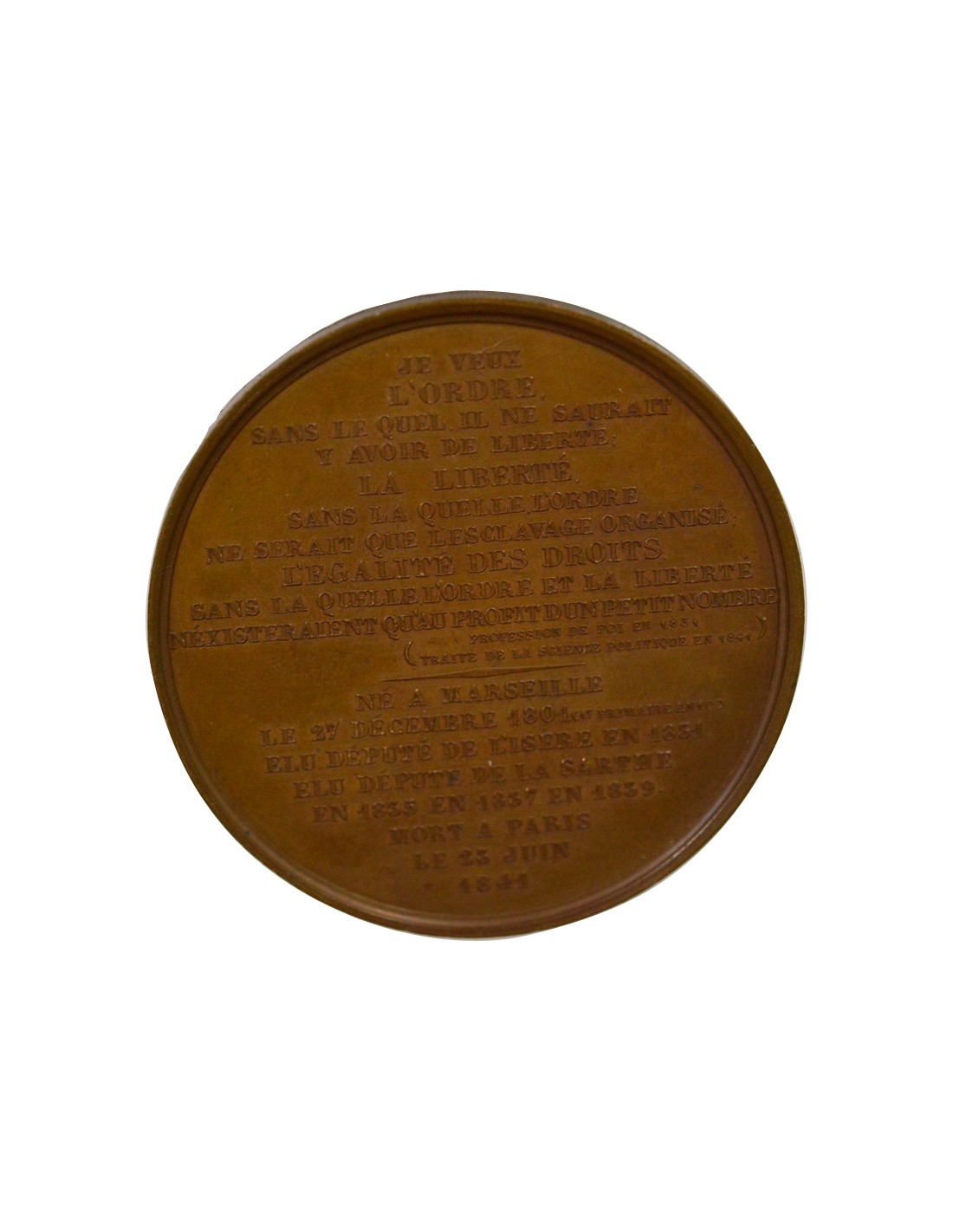 Revers : JE VEUX / L'ORDRE, / SANS LE QUEL IL NE SAURAIT / Y AVOIR DE LIBERTE ; / LA LIBERTE, SANS LA QUELLE, L'ORDRE / NE SAURAIT QUE L'ESCLAVAGE ORGANISE ; / L'EGALITE DES DROITS, / SANS LA QUELLE L'ORDRE ET LA LIBERTE / N'EXISTERAIENT QU'AU PROFIT D'UN PETIT NOMBRE / (PROFESSION DE FOI EN 1831) / (TRAITE DE LA SCIENCE POLITIQUE EN 1841) / NE A MARSEILLE / LE 27 DECEMBRE 1801 (17 FRIMAIRE AN 10) / ELU DEPUTE DE L'ISERE EN 1831, / ELU DEPUTE DE LA SARTHE / EN 1835, EN 1837, EN 1839 . / MORT A PARIS / LE 25 JUIN / 1841 .