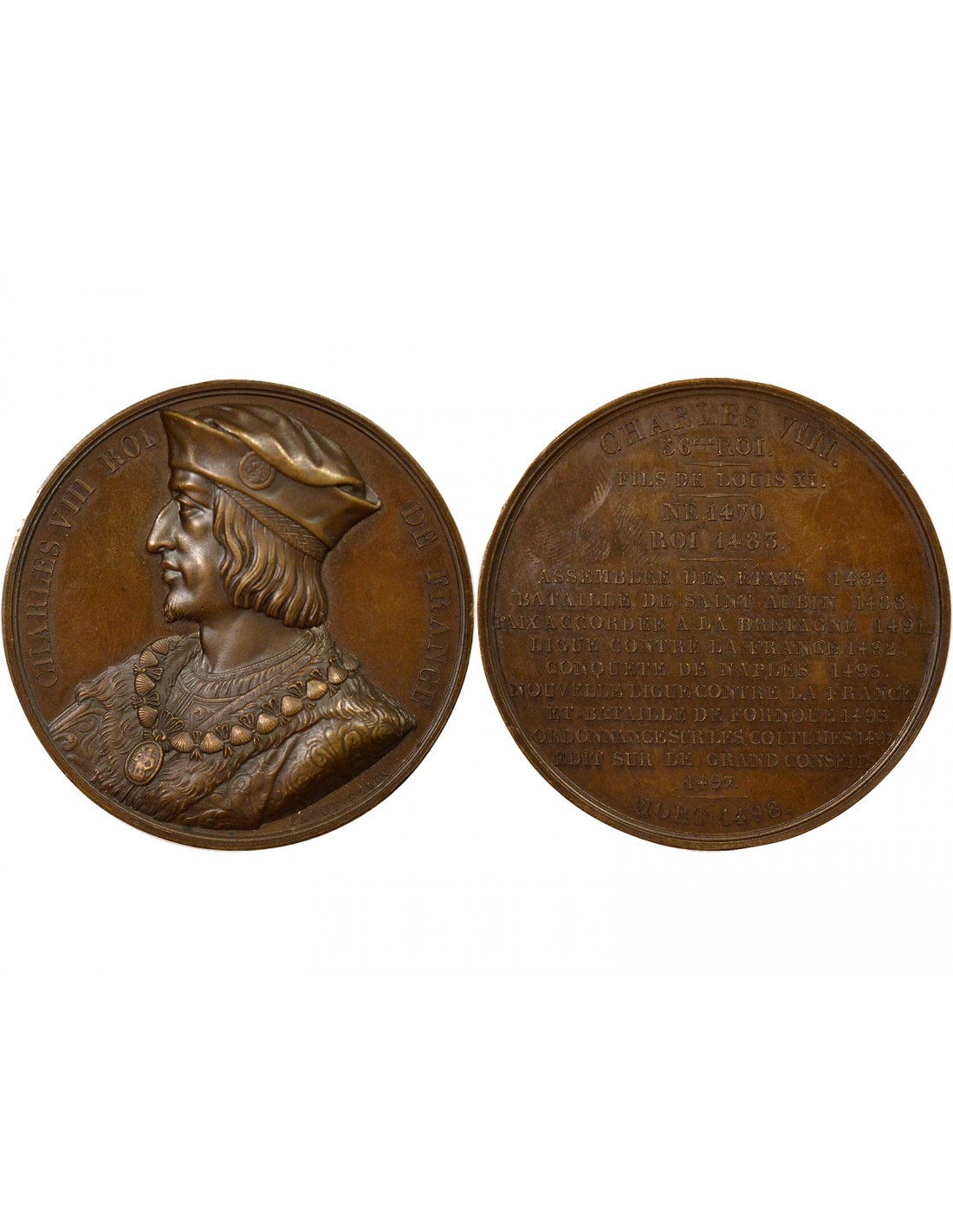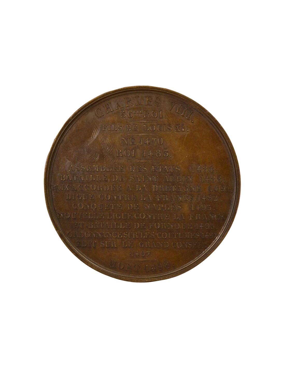 Revers : CHARLES VIII . / 56 EME. ROI . / FILS DE LOUIS XI . / NE 1470 . / ROI 1483 . / ASSEMBLEE DES ETATS 1484 . / BATAILLE DE SAINT AUBIN 1488 . / PAIX ACCORDEE A LA BRETAGNE 1491 . / LIGUE CONTRE LA FRANCE 1492 . / CONQUETE DE NAPLES 1495 . / NOUVELLE LIGUE CONTRE LA FRANCE / ET BATAILLE DE FORNOUE 1495 . / ORDONNANCE SUR LES COUTUMES 1497 / EDIT SUR LE GRAND CONSEIL / 1497 . / MORT 1498 .