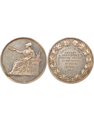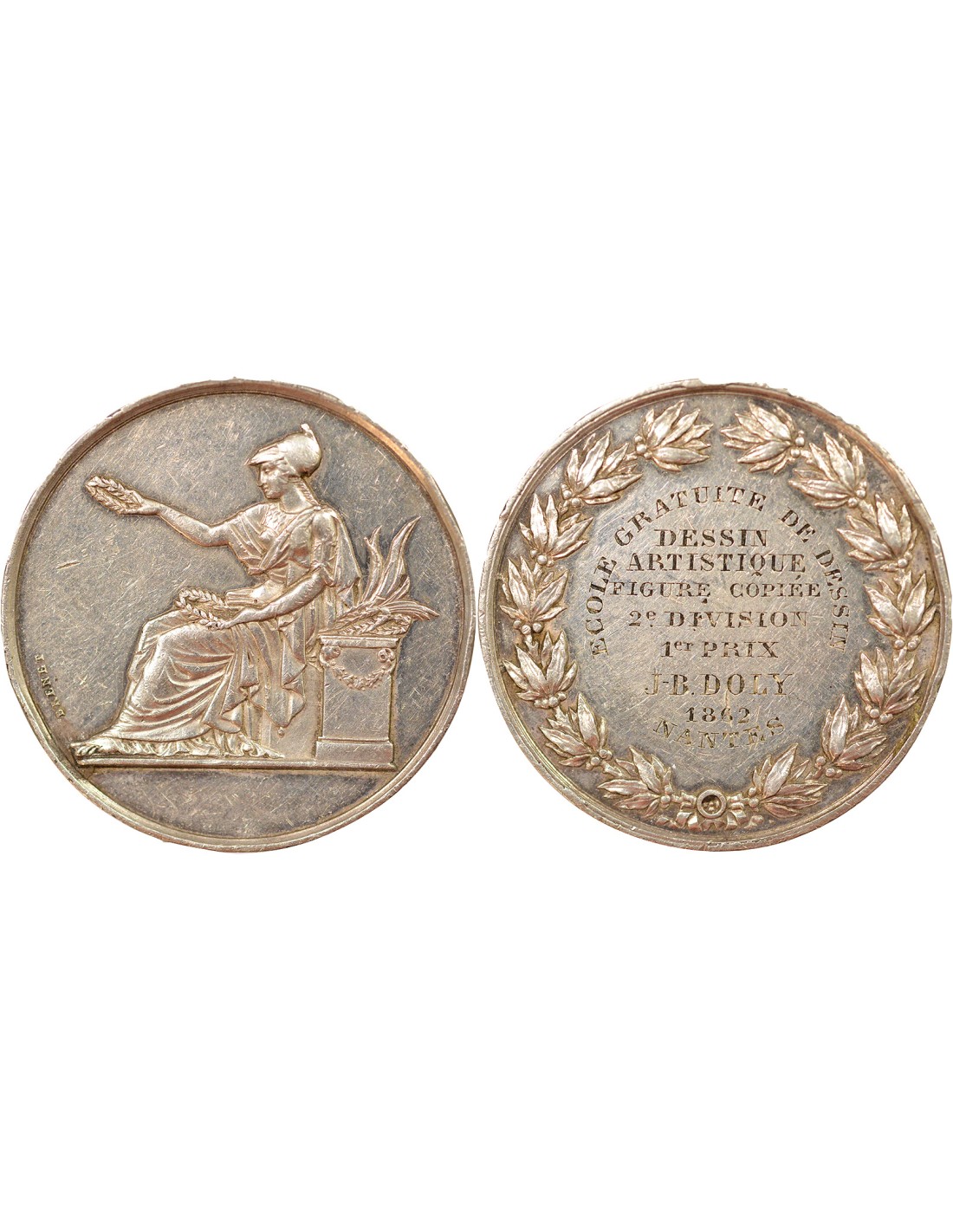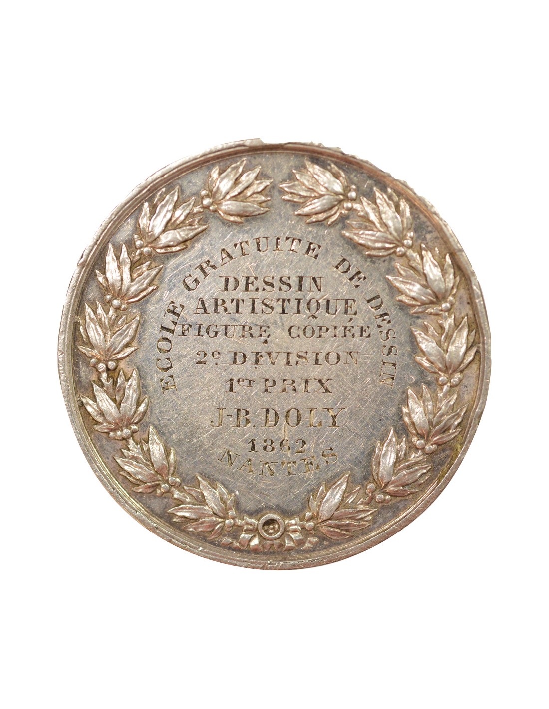 Revers : ECOLE GRATUITE DE DESSIN / DESSIN / ARTISTIQUE / FIGURE COPIEE / 2e. DIVISION / 1r. PRIX / J-B DOLY / 1862 / NANTES
