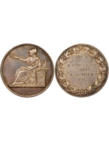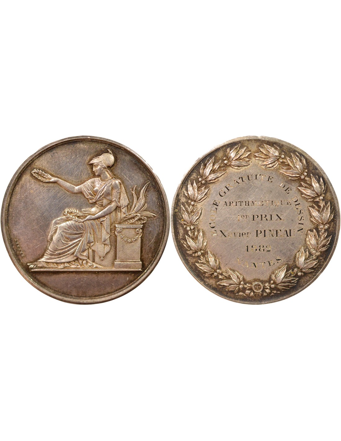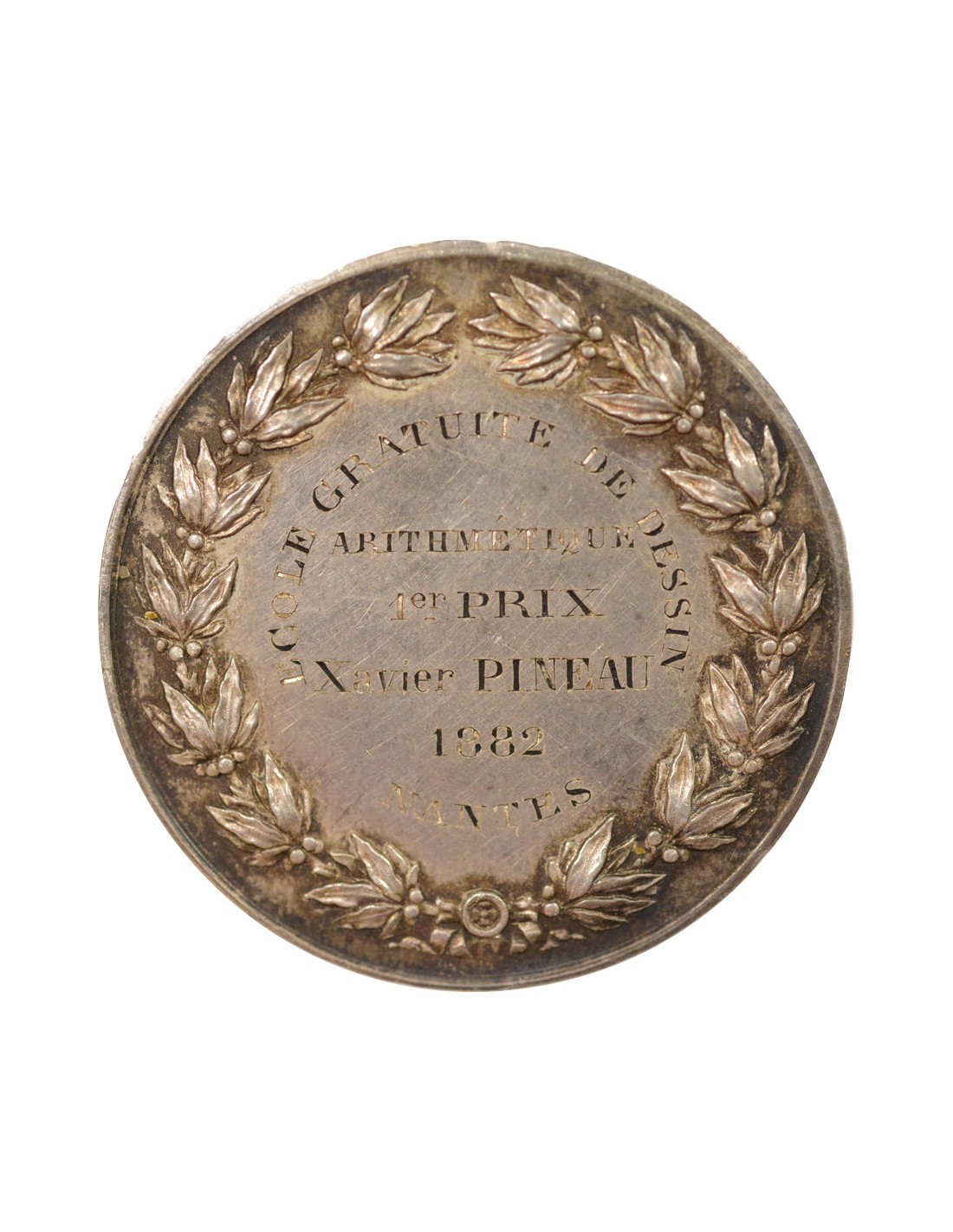 Revers : ECOLE GRATUITE DE DESSIN / ARITHMETIQUE / 1er. PRIX / XAVIER PINEAU / 1882 / NANTES