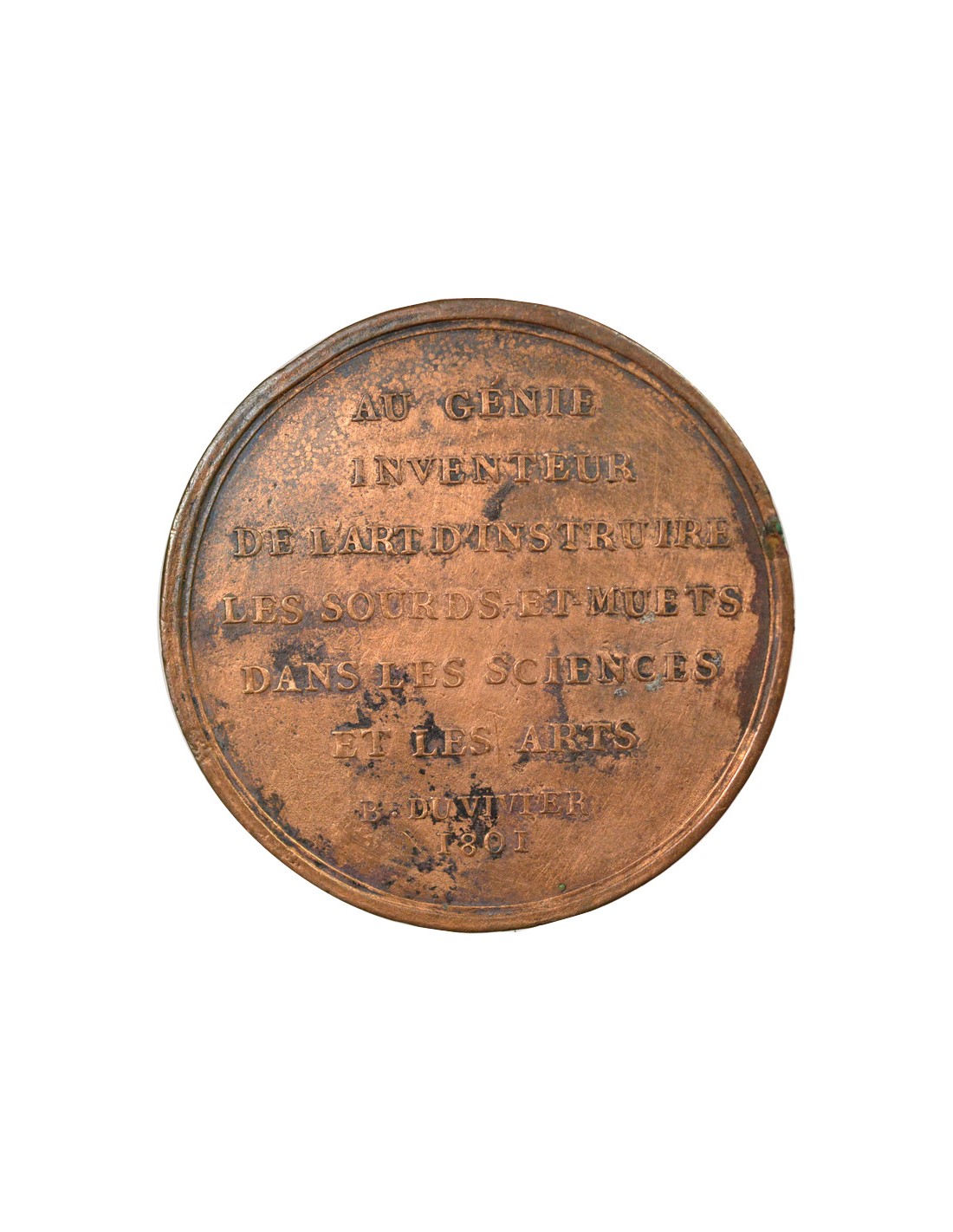 Revers : AU GÉNIE / INVENTEUR / DE L’ART D’INSTRUIRE / LES SOURDS-ET-MUETS / DANS LES SCIENCES / ET LES ARTS / B. DUVIVIER / 1801