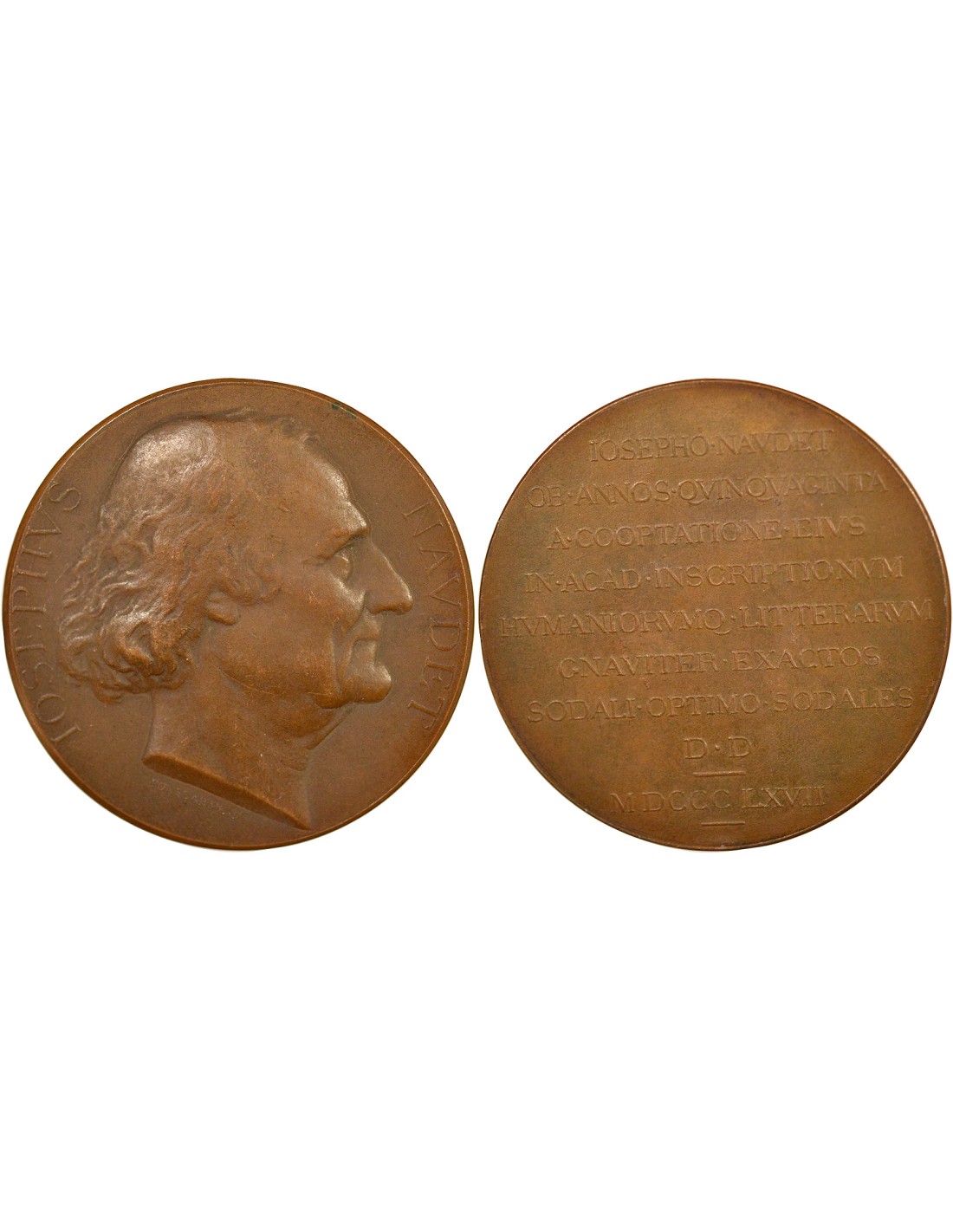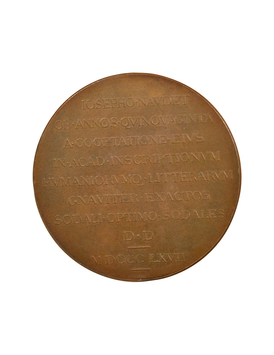 Revers : IOSEPHO . NAVDET / OB . ANNOS . QVINQVACINTA / A . COOPTATIONE . EIVS / IN . ACAD . INSCRIPTIONVM / HVMANIORVMQ . LITTERARVM / GNAVITER . EXACTOS / SODALI . OPTIMO . SODALES / D . D / M DCCC LXVII
