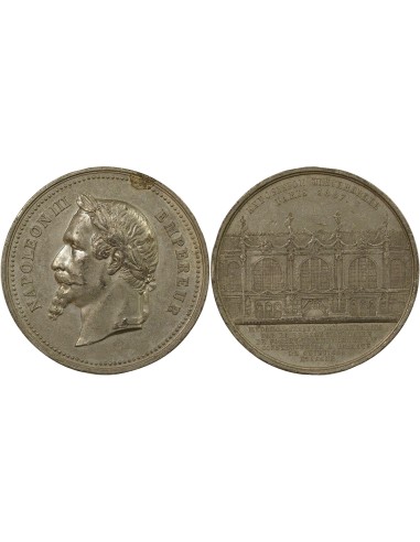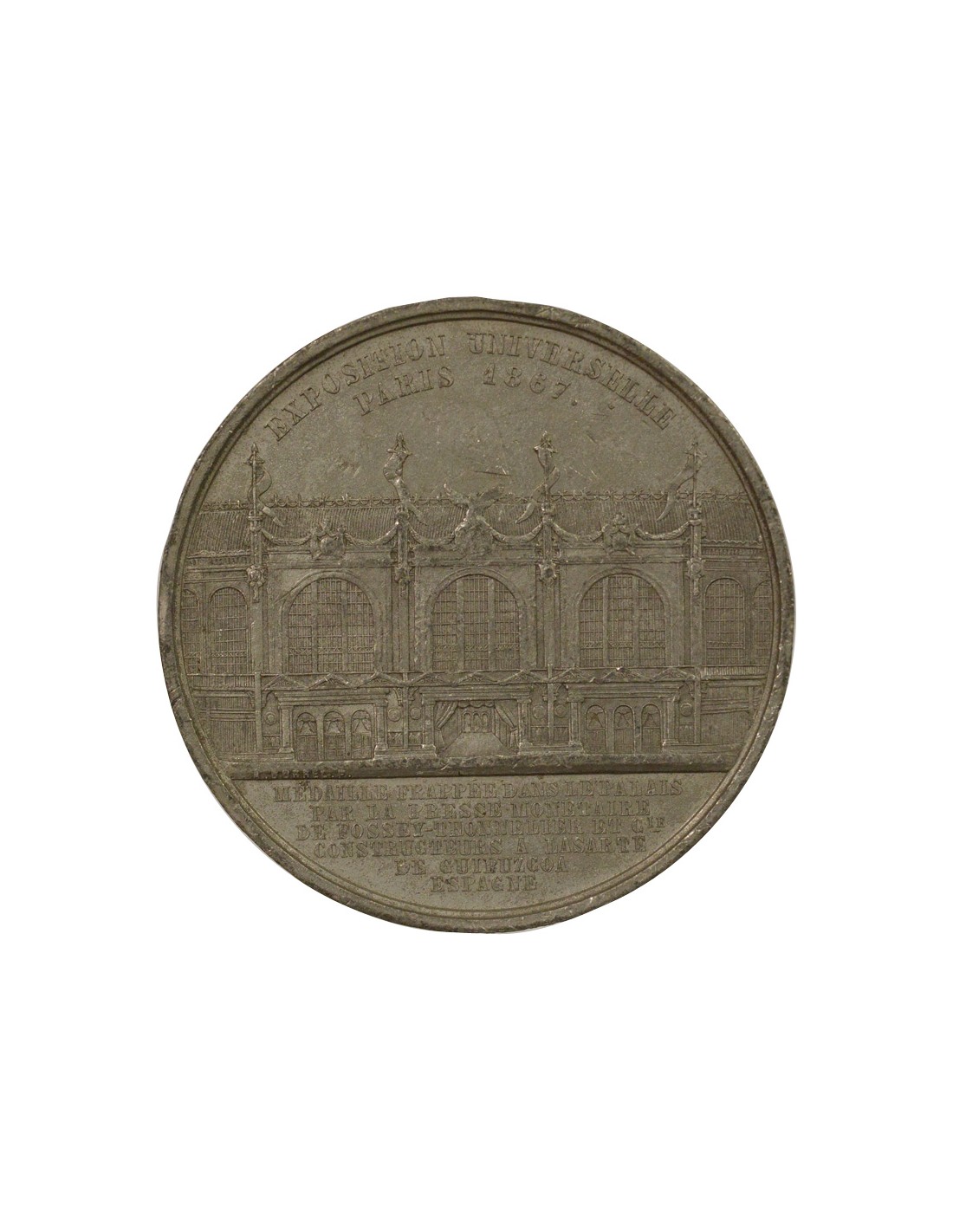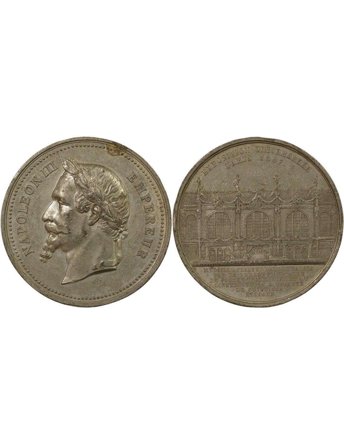 Revers : EXPOSITION UNIVERSELLE / PARIS 1867 / MEDAILLE FRAPPEE DANS LE PALAIS / PAR LA PRESSE MONETAIRE / DE FOSSEY-THONNELIER ET CIE / CONSTRUCTEURS A LASARTE / DE GUIPUZCOA / ESPAGNE