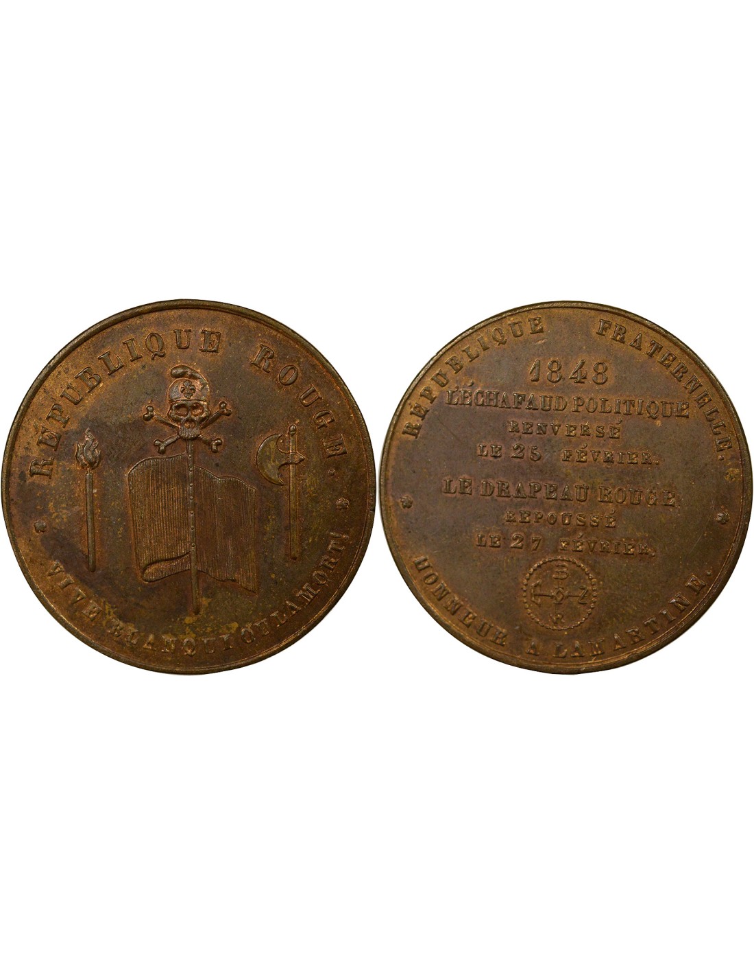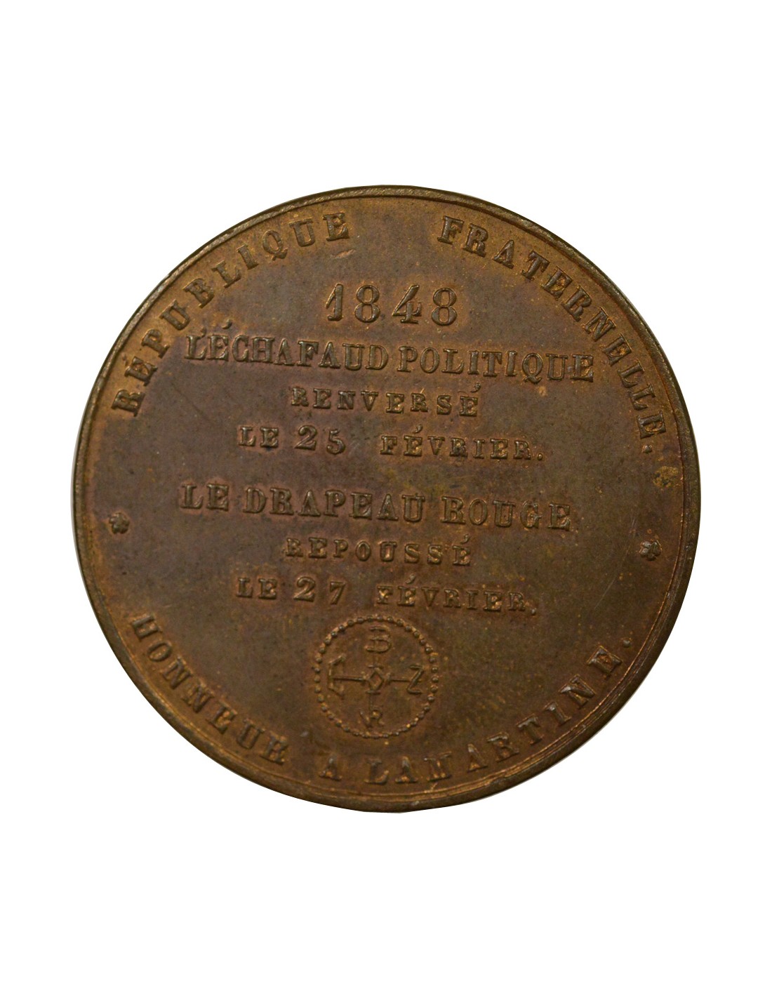 Revers : REPUBLIQUE FRATERNELLE / HONNEUR A LAMARTINE / 1848 / L'ECHAFAUD POLITIQUE / RENVERSE / LE 23 FEVRIER . / LE DRAPEAU ROUGE / REPOUSSE / LE 27 FEVRIER .
