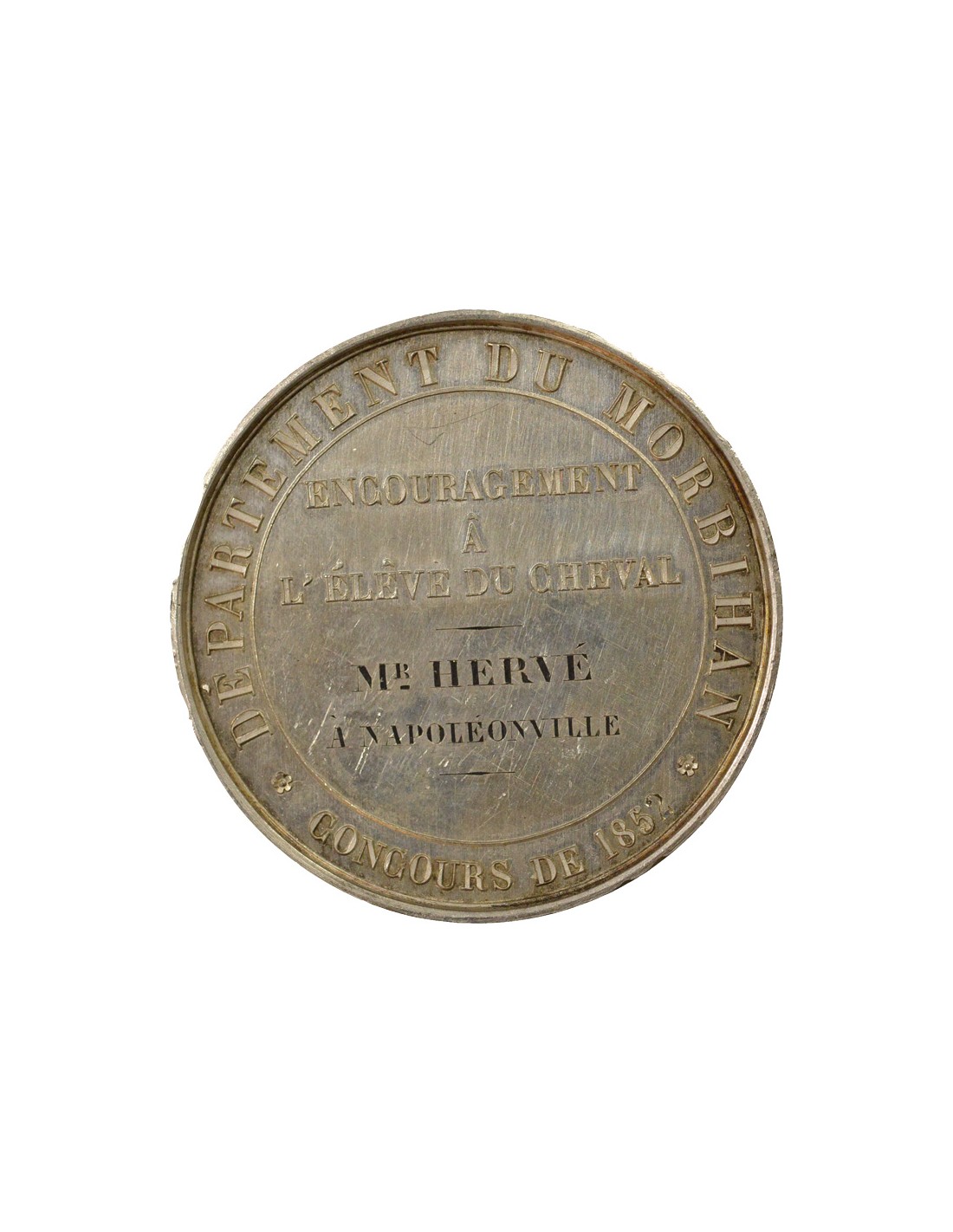 Revers : DEPARTEMENT DU MORBIHAN / CONCOURS DE 1852 / ENCOURAGEMENT / A / L'ELEVE DU CHEVAL / MR. HERVE / A NAPOLEONVILLE