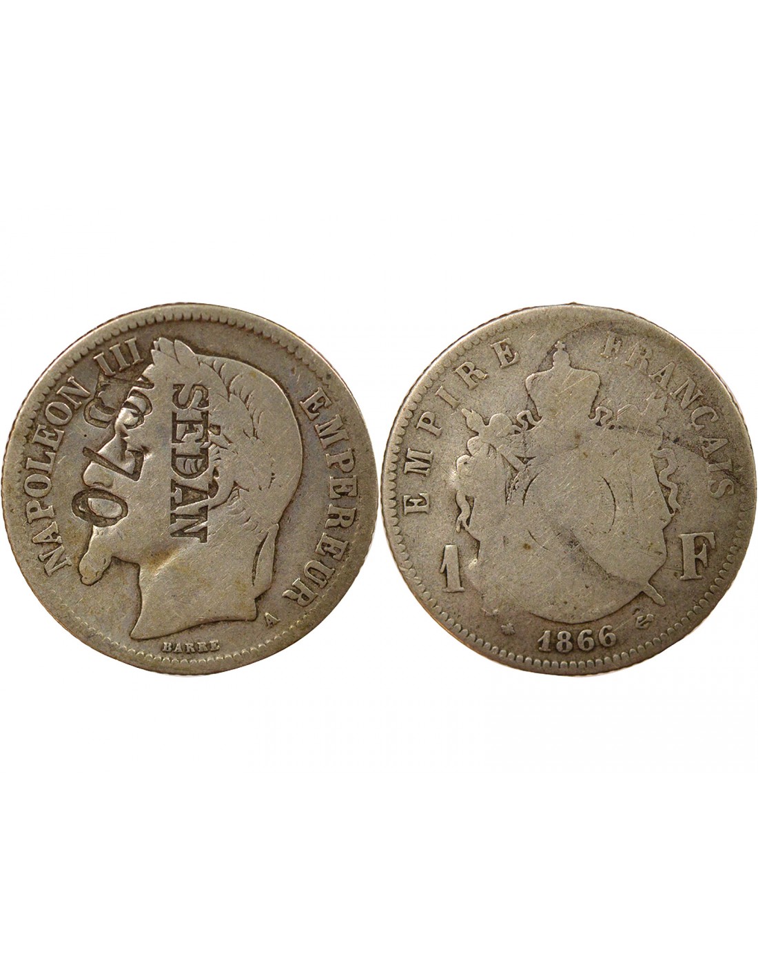 Vendu Monnaies satiriques NAPOLEON III - 1 FRANC ARGENT 1852 A PARIS - SURCHARGE SEDAN SUFFREN sf_19139 25,00 € Charles Louis Napoléon Bonaparte, dit Louis-Napoléon Bonaparte puis Napoléon III, est né à Paris, le 20 avril 1808 et mort à Chislehurst au Royaume-Uni, le 9 janvier 1873. Il est le premier président de la République française, élu le 10 décembre 1848 au suffrage universel masculin, avant d'être proclamé empereur des Français le 2 décembre 1852 sous le... View