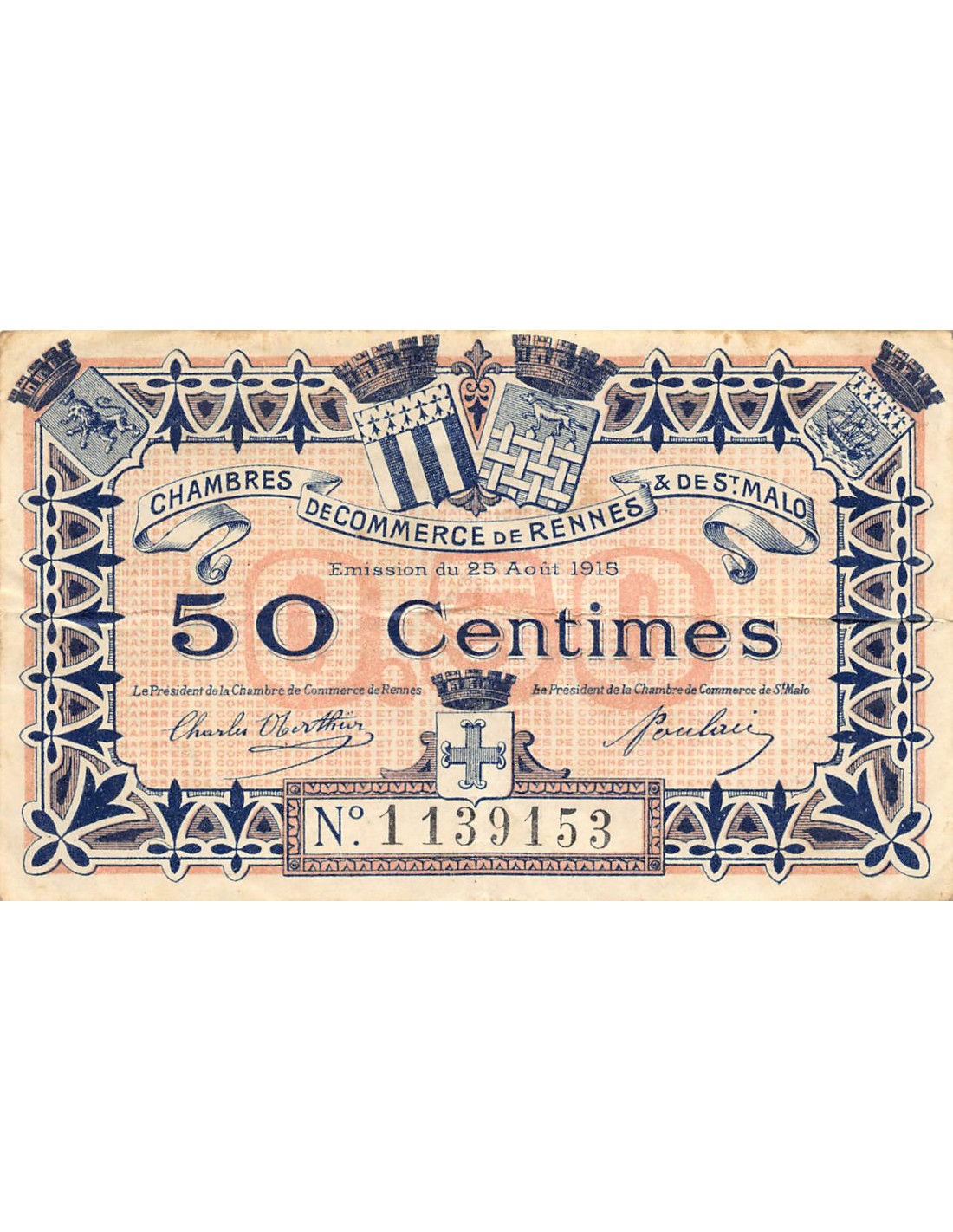 CHAMBRE DE COMMERCE, RENNES ET SAINT-MALO - 50 CENTIMES 1915